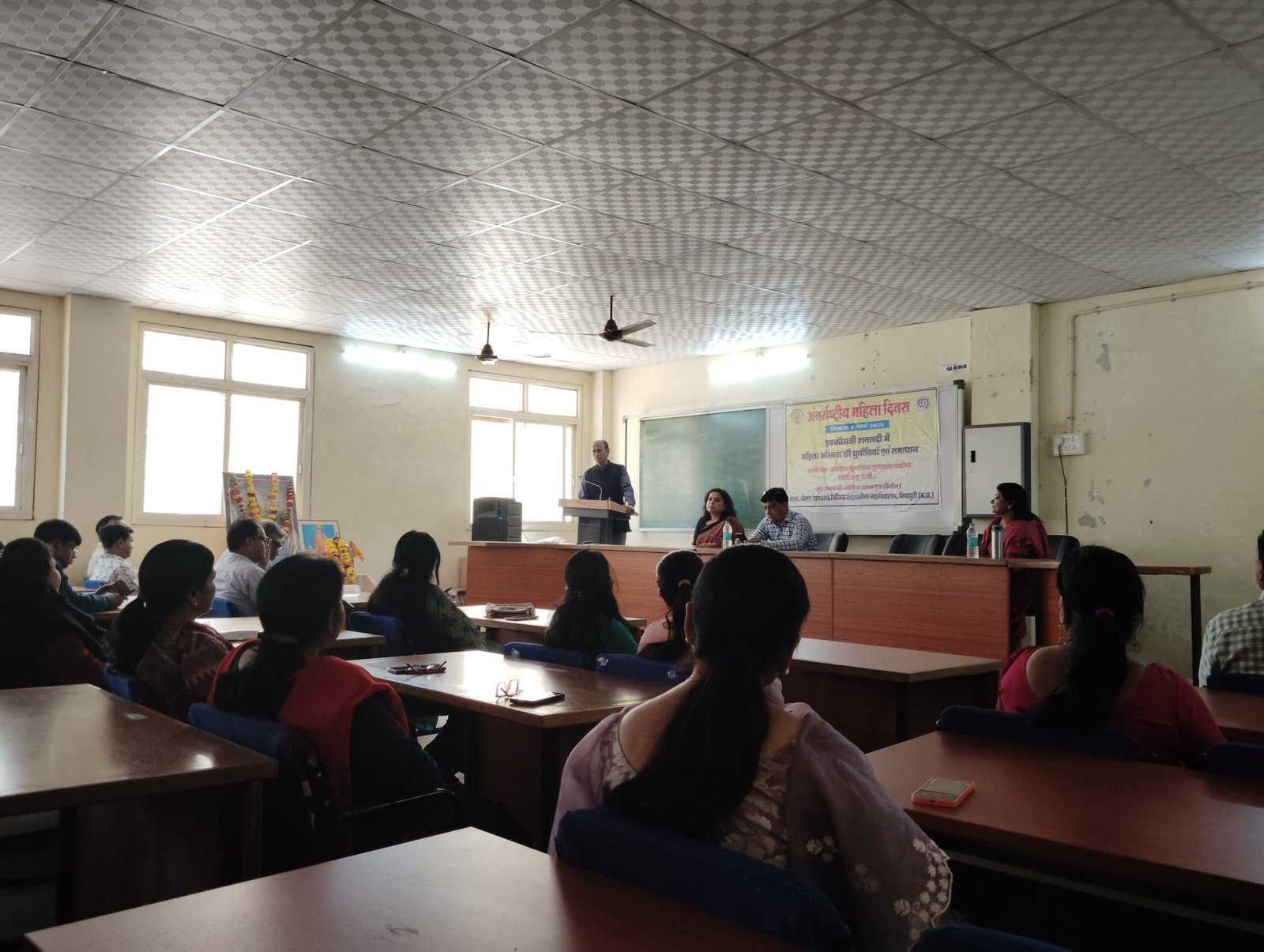 रसायन शास्त्र विभाग की विभागाध्यक्ष प्रो ममता रानी ने महिलाओं के विज्ञान, कला, एवम सामाजिक आर्थिक छेत्रो में दिए जा रहे योगदान की बहुत विस्तार से चर्चा कर प्रेरक उद्बोधन दिया। एम ए अंग्रेजी साहित्य की छात्रा सोनल भार्गव ने महिलाओं के द्वारा किये जा रहे संघर्षों की चर्चा की। अंग्रेजी विभाग के वरिष्ठ प्राध्यापक डॉ गुलाब सिंह ने कहा कि महिलाओं के निरंतर सशक्तिकरण के कारण महिलाओं का योगदान समाज एवम कार्यछेत्र में बहुत बढ़ गया है। राजनीति विज्ञान के विभागाध्यक्ष प्रो पुनीत कुमार ने महिला सशक्तिकरण के आंदोलन के अपने मूल पथ से भटकने पर ध्यान आकर्षित किया। जनभागीदारी अध्यक्ष श्री अमित भार्गव ने महिलाओं को स्वयं आगे बढ़कर अपना संघर्ष शुरू करने पर जोर दिया और आवाहन किया कि महिलाओं के आगे बढ़ने पर उनका साथ देने के लिए सभी तैयार हैं। कार्यक्रम के अंत में कार्यक्रम की संयोजक अर्थशास्त्र विषय की वरिष्ठ प्राध्यापक डॉ मंजुलता गर्ग ने सभी का आभार प्रदर्शन किया। कार्यक्रम का संयोजन अंग्रेजी विभाग की सहायक प्राध्यापक डॉ पल्लवी शर्मा गोयल द्वारा किया गया जिन्होंने सम्पूर्ण कार्यक्रम की कड़ियाँ जोड़ते हुए एवम अपना अभिमत प्रस्तुत करते हुए अपने विचार रखे।इस महिला दिवस पर एक अभिनव पहल करते हुए प्राचार्य प्रो पवन कुमार श्रीवास्तव, एवम जनभागीदारी अध्यक्ष ने वनस्पति शास्त्र प्रयोगशाला का नाम भारतीय महिला बोटनिस्ट जानकी अम्मल के नाम पर करने की घोषणा की जिनका योगदान साइटोजेनेटिक्स ब्रांच में अभूतपूर्व रहा है।