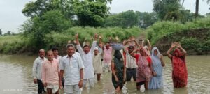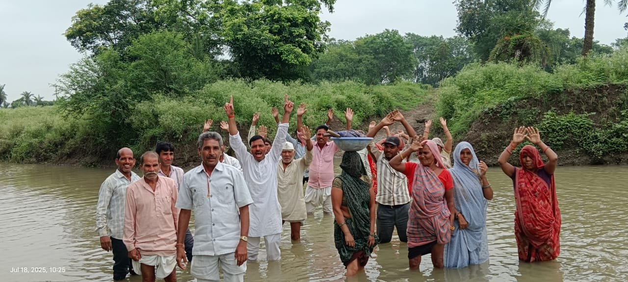ग्रामीणो ने नदी पर पूल निर्माण को लेकर नदी मे उतर कर किया प्रर्दशन