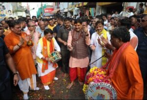 उज्जैन। पवित्र श्रावण माह के दूसरे सोमवार को उपमुख्यमंत्री श्री राजेन्द्र शुक्ल ने उज्जैन में बाबा महाकाल के दर्शन किए और प्रदेशवासियों के सुख, समृद्धि एवं कल्याण की प्रार्थना की। मुख्यमंत्री डॉ. मोहन यादव, उपमुख्यमंत्री श्री शुक्ल और नगरीय विकास एवं आवास मंत्री श्री कैलाश विजयवर्गीय बाबा महाकाल की परंपरागत सवारी में श्रद्धा एवं भक्ति भाव से शामिल हुए। भगवान महाकाल की पालकी जैसे ही महाकालेश्वर मंदिर प्रांगण से निकली, पूरा वातावरण हर-हर महादेव के जयकारों से गुंजायमान हो उठा।