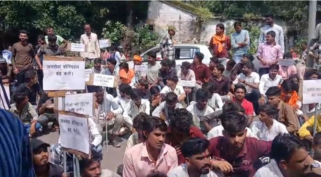 आयुष्मान कार्ड होने के बाद भी रुपए मांगे, निजी जनसेवा अस्पताल के सामने हिंदू युवा संगठन के कार्यकर्ताओं का धरना