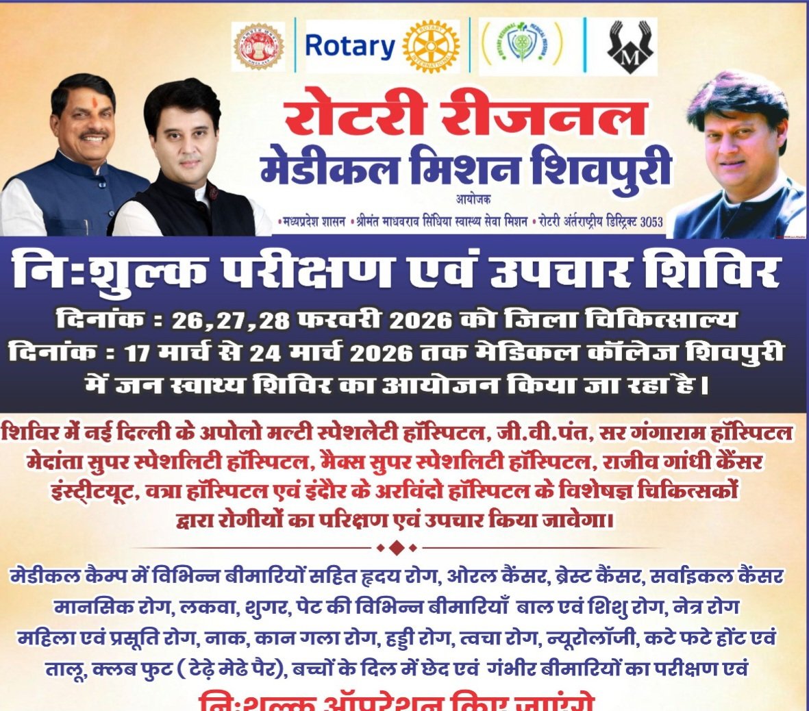 रोटरी क्लब इंटरनेशनल एवं श्रीमंत माधव राव सिधिया स्वास्थ्य सेवा मिशन अंतर्गत तीन दिवसीय स्वास्थ्य परीक्षण शिविर जिला चिकित्सालय शिवपुरी में दिनांक 26 फरवरी 2026 से 28 फरवरी 2026 तक आयोजित किया जा रहा हैं। इस शिविर में रोगियों को सीटी स्केन, एक्सरे, अल्ट्रा साउंड, समस्त प्रकार की पैथलॉजी जांच के साथ विशेषज्ञ चिकित्सकों द्वारा परीक्षण किया जाएगा।
