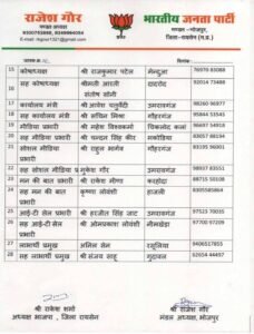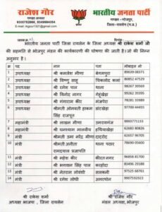 भारतीय जनता पार्टी भोजपुर मंडल की नई कार्यकारिणी की घोषणा कर दी गई है। मंडल अध्यक्ष राजेश गौर द्वारा जारी सूची में जिला अध्यक्ष राकेश शर्मा की सहमति से विभिन्न पदों पर पदाधिकारियों की नियुक्ति की गई है। नई कार्यकारिणी में संगठन को मजबूत करने और पार्टी की गतिविधियों को गांव-गांव तक पहुंचाने के उद्देश्य से 28 पदाधिकारियों को जिम्मेदारी सौंपी गई है।